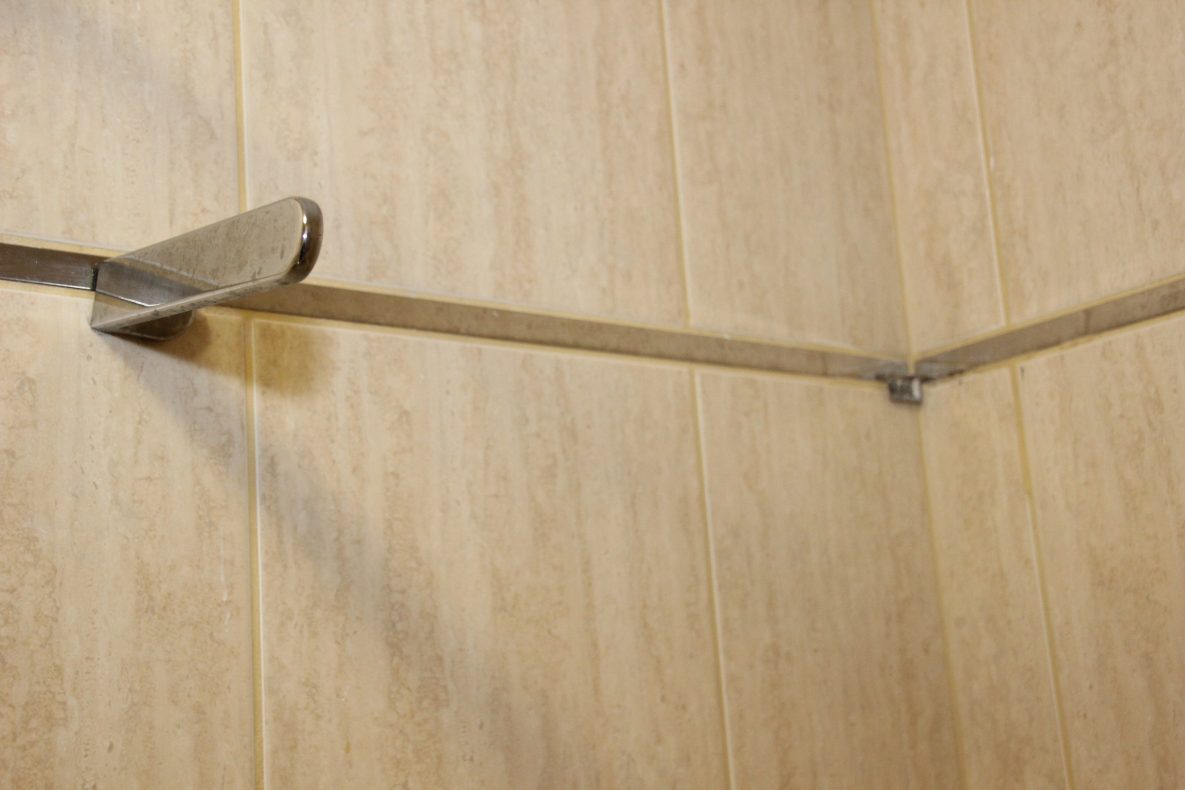 Der Handtuchhalter hat seine Stange verloren. Ein Arm ist ohnehin abgerissen und bildet damit einen Zustand, der perfekt zum Rest der Einrichtung passt.