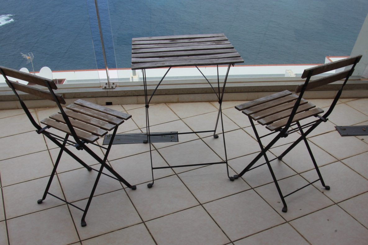 Ein mutiger Ansatz, wenn man bedenkt, dass auf der Terrasse zwei Holzstühle stehen. Der zugehörige Tisch ist so uneben, das Getränke jederzeit umkippen können. Wer zu viert reist, darf sich also auf ein innovatives Sitzkonzept freuen: Schichtbetrieb. Vielleicht war das als „kanarische Entschleunigung“ in der Anzeige gemeint. Ein Erfahrungsbericht: