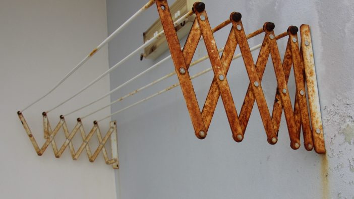 Der Wäscheständer, ein ausklappbares Modell, scheint noch aus der Franco‑Ära zu stammen. Rost ist so präsent, dass frisch gewaschene Kleidung zuverlässig mit rostbraunen Erinnerungen an den Urlaub verziert würde.
