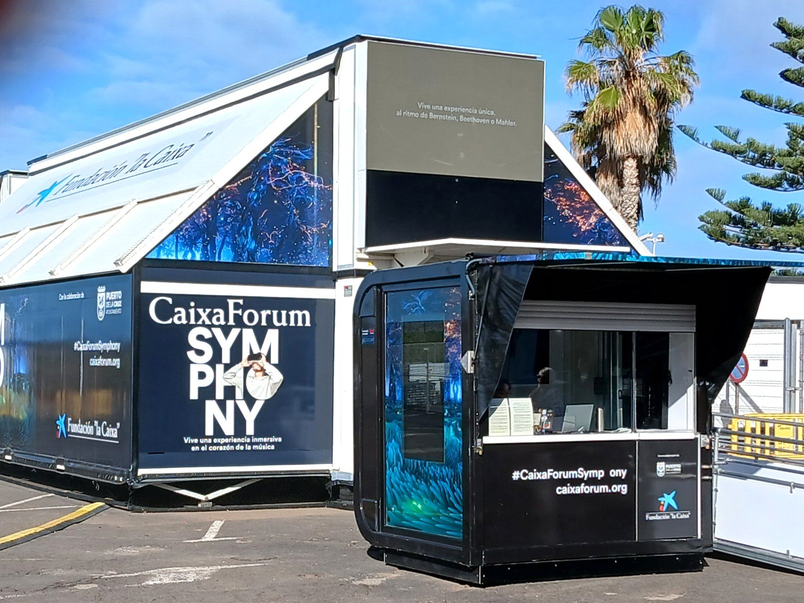Auf der Explanada del Muelle in Puerto de la Cruz steht derzeit ein mobiler Pavillon der „Fundación la Caixa”. In ihm wird die audiovisuelle Musikinstallation „Symphonie“ präsentiert, ein Projekt, das klassische Musik mithilfe von Virtual‑Reality‑Technik in einer immersiven Form erfahrbar macht.