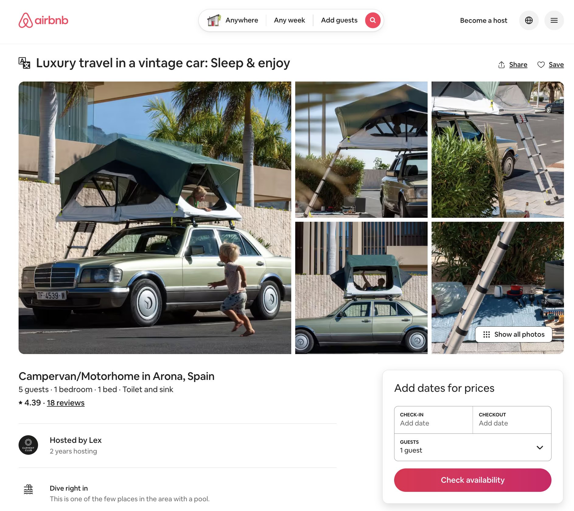 Zu sehen ist dabei ein Mercedes-Benz-Oldtimer aus dem Jahr 1986. Der 39 Jahre alte 260 SE steht in Arona im Süden von Teneriffa. Auf das Dach wurde ein Zelt geschnallt, das über eine Leiter zu besteigen ist. Inhaltlich war es das bereits mehr oder weniger. Dennoch wird mehr versprochen – und es gibt eine sehr konkrete Warnung: